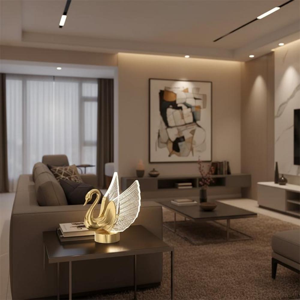 أباجورة البجعة T643 الفاخرة تصميمها المستوحى من شكل بجعة ذهبية بأجنحة شفافة يمنحها حضورًا فنيًا راقيًا ، يمزج بين الرقي والجمال تأتي بلون ذهبي لامع وقاعدة معدنية متينة ، مع جناحين من الأكريليك الشفاف يعكسان الضوء بشكل ناعم وأنيق ، تعمل الأباجورة بلمبة E27 وتوفر إضاءة دافئة بدرجة حرارة لون 3000K، لتضفي أجواء مريحة ومثالية للمساحات الداخلية الراقية.