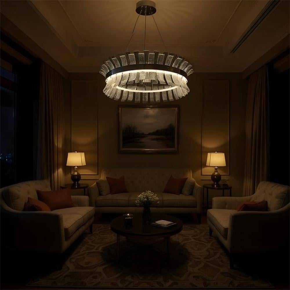ثريا بيفيل الدائرية – موديل MD5196 – هي التعبير الأمثل عن التقاء الفن المعماري بالإضاءة الحديثة، حيث تنسجم الطبقات الزجاجية المائلة مع الهيكل الكرومي لتنتج توزيعًا ضوئيًا ديناميكيًا ومريحًا للعين. تصميم هندسي جريء بتفاصيل متداخلة يجعلها قطعة مركزية لافتة في أي ديكور داخلي فخم.