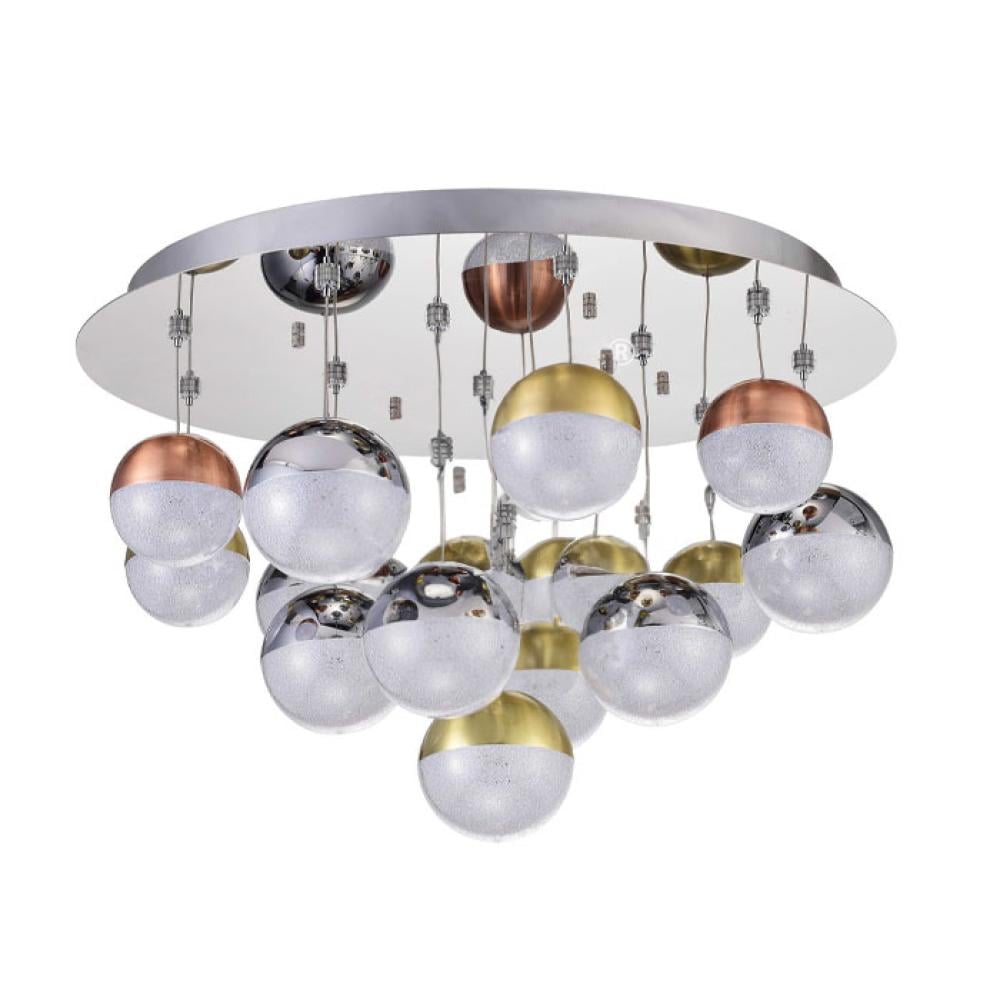 - التصميم: ثريا عصرية بلمسات كروم أنيقة وكرات زجاجية كريستالية ملونة.
