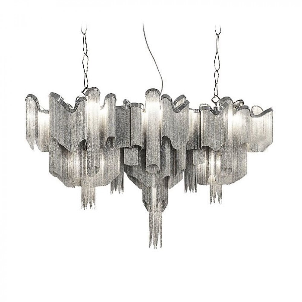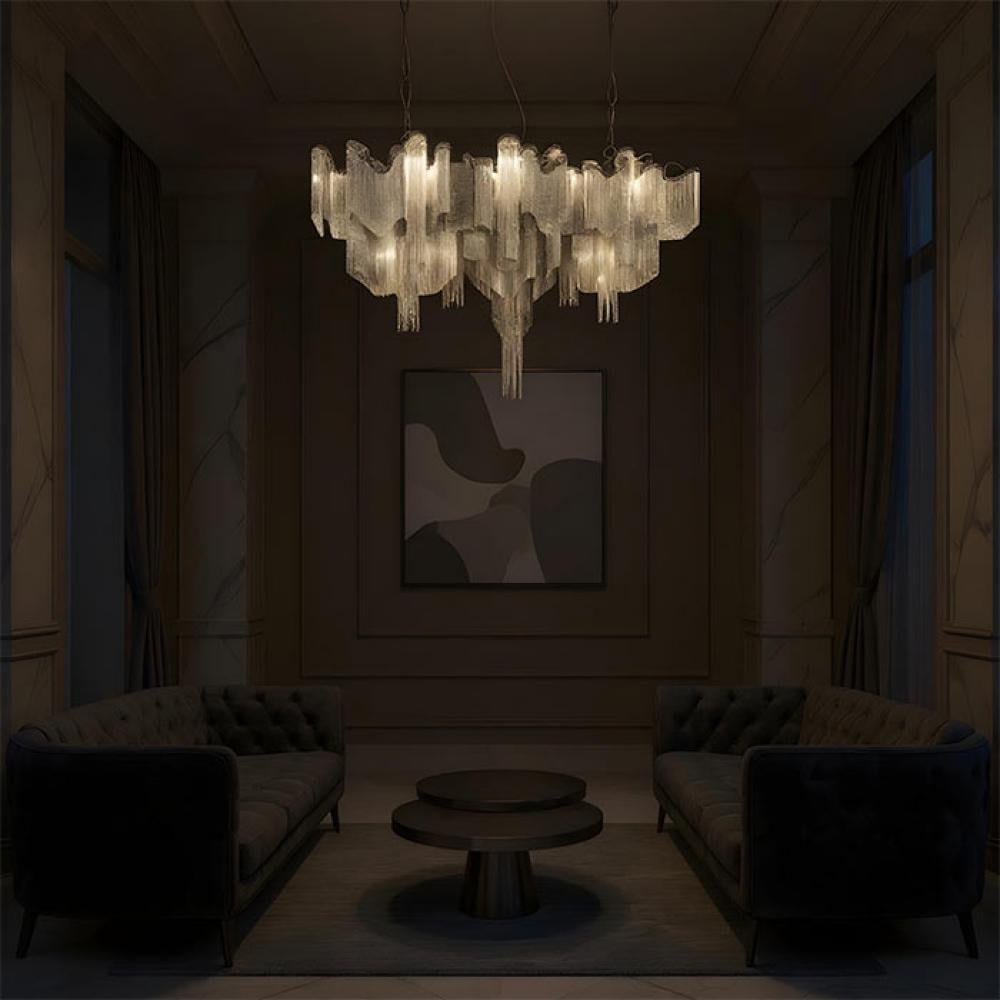 ثريا سلاسل HS3201 تجسيد فاخر للفن العصري ، بتصميم انسيابي مذهل يتألف من سلاسل معدنية تتدلى بانسيابية لتمنح الإضاءة عمقًا وأناقة لا مثيل لها. تأتي الثريا بلونين راقيين: الكروم الفضي العصري، والذهبي الفاخر لتناسب مختلف أنماط الديكور الداخلي.