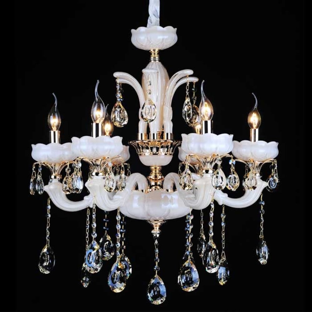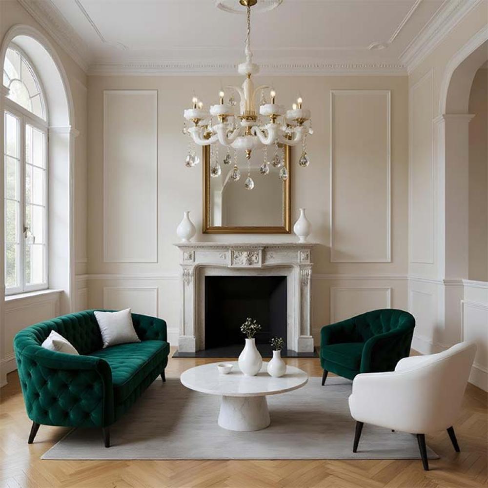 تجمع بين الإطار الذهبي الفاخر والأذرع البيضاء الشفافة التي تعكس الضوء بتناغم ساحر ، مزودة بفصوص كريستال K9 عالية اللمعان، مما يجعلها خيارًا مثاليًا لإضاءة المجالس، الصالات، أو غرف الطعام بلمسة ملكية.