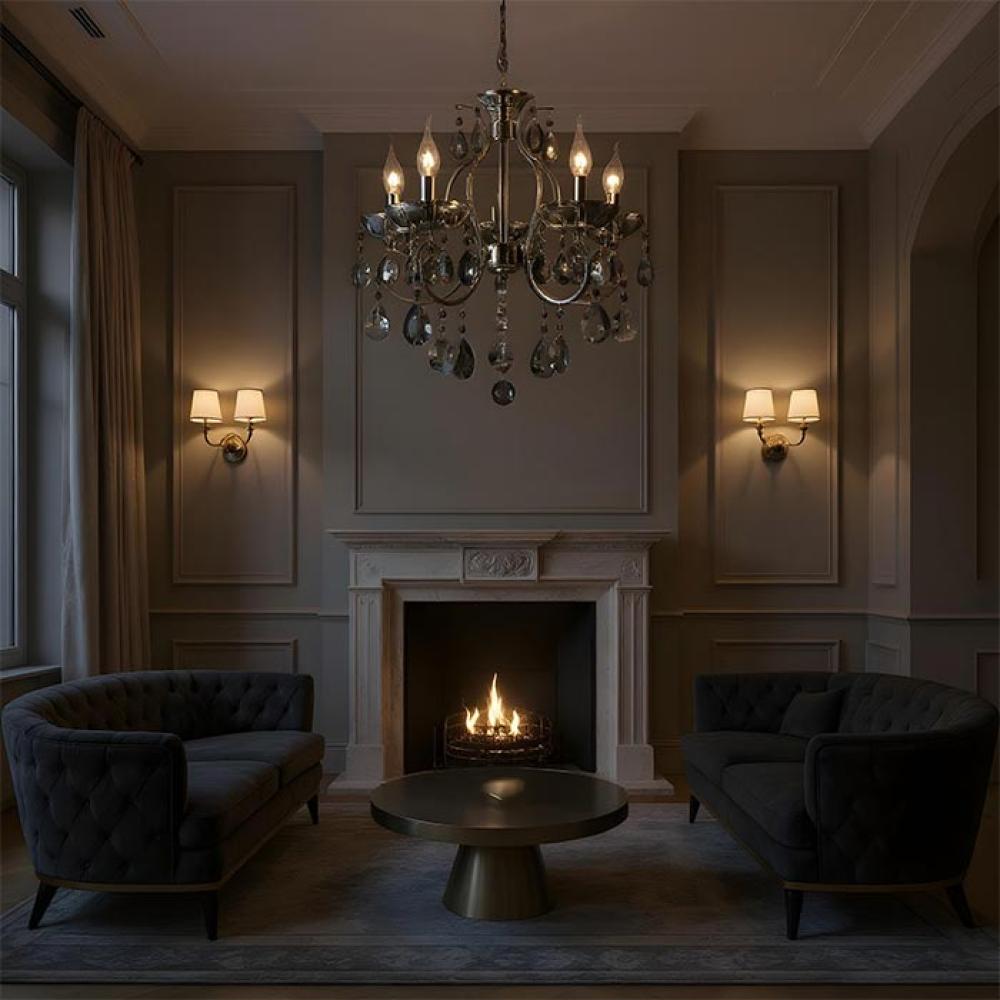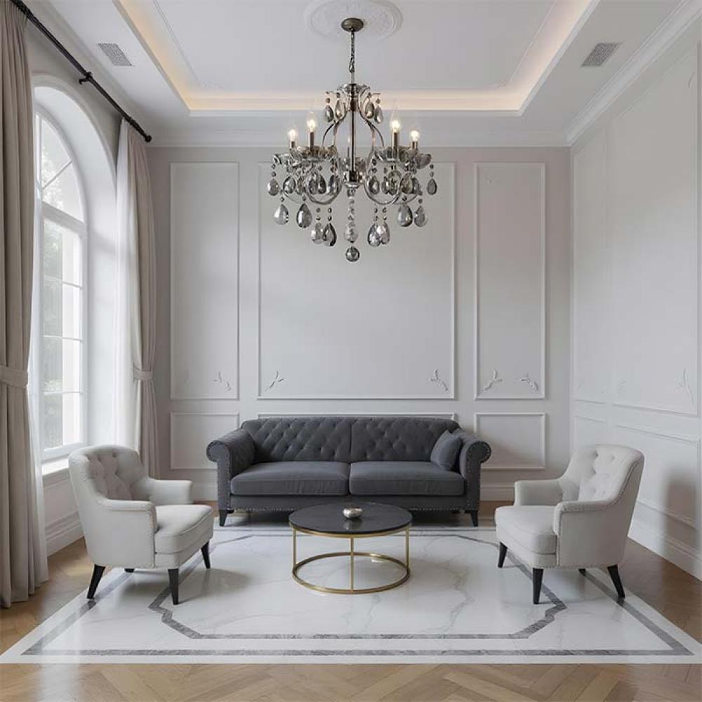 عزّز أناقة مساحتك ثريا كريستال موديل 8789 بتصميمها المعدني الكرومي اللامع والكريستالات الدخانية المتدلية التي تعكس الإضاءة بنعومة وانسيابية ، هذه الثريا تضيف لمسة من الفخامة المتزنة والأناقة المعاصرة ، متوفرة بخيارين من عدد الأذرع (3 أو 5) لتناسب مختلف الفراغات المنزلية.