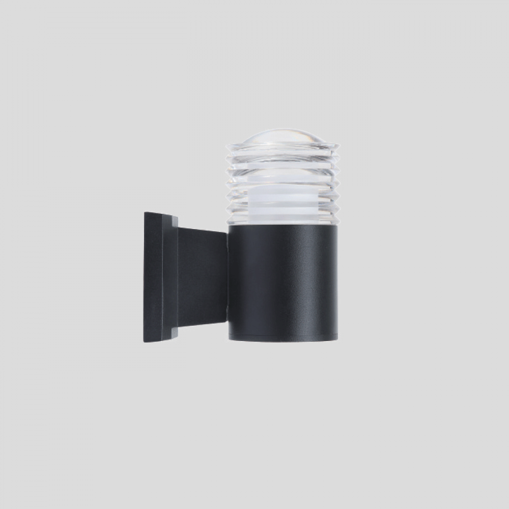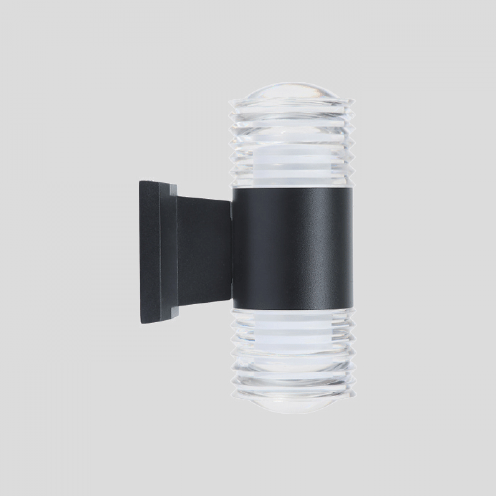 ارتقِ بجمال واجهتك مع الأبليك الجداري موديل B2158 من Siera، بتصميمه الأسطواني العصري ولونه الأسود الفخم مع زجاج شفاف محفور بخطوط حلزونية تضيف لمسة ديكورية أنيقة للإضاءة.