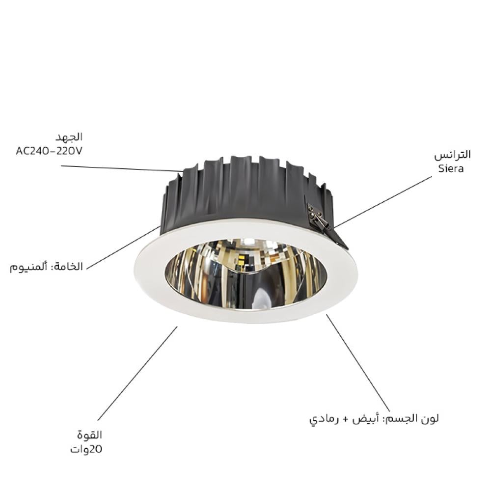تصميم داخلي هندسي مربع يجمع بين الأداء العالي والشكل العصري. مزوّد بشريحة OSRAM COB LED وترانس من نفس الشركة الألمانية، ويمنحك كفاءة ضوئية تصل إلى 90 لومن/وات مع راحة بصرية بزاوية 60° ومؤشر توهج منخفض UGR<19.