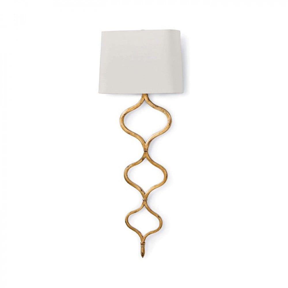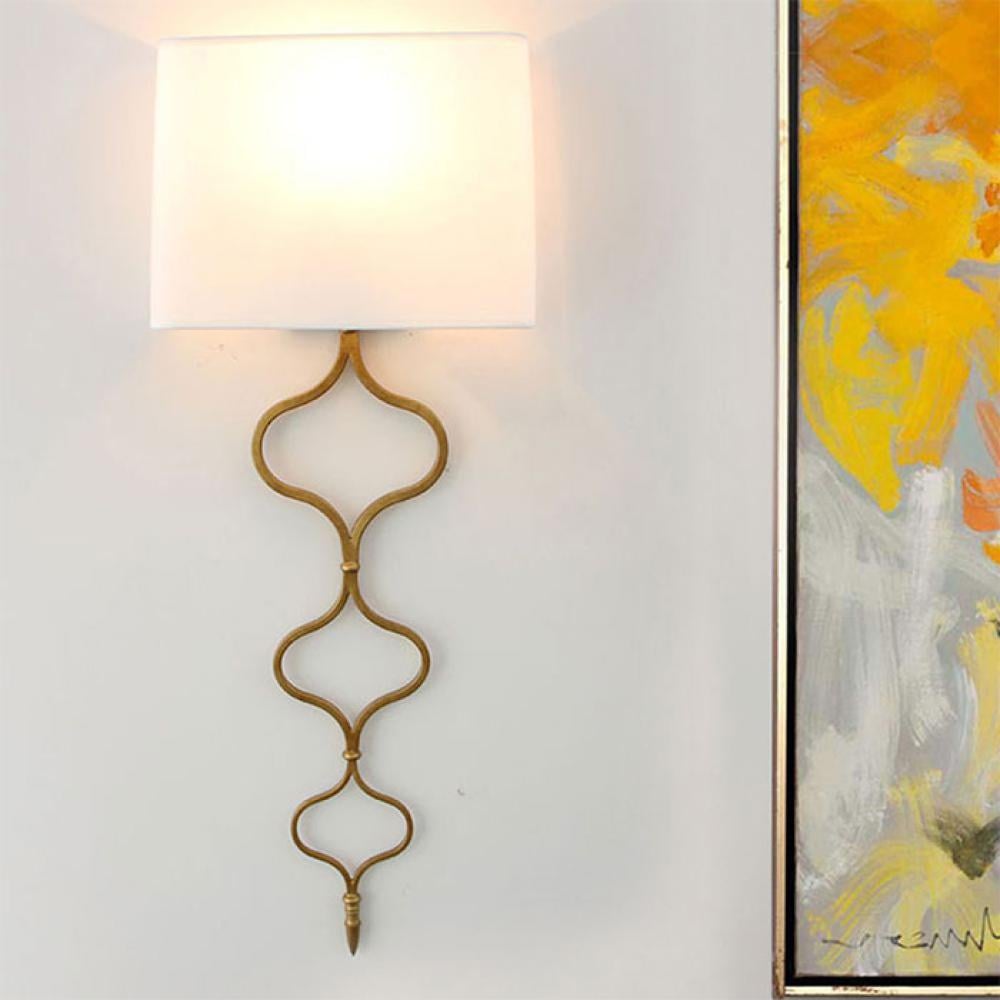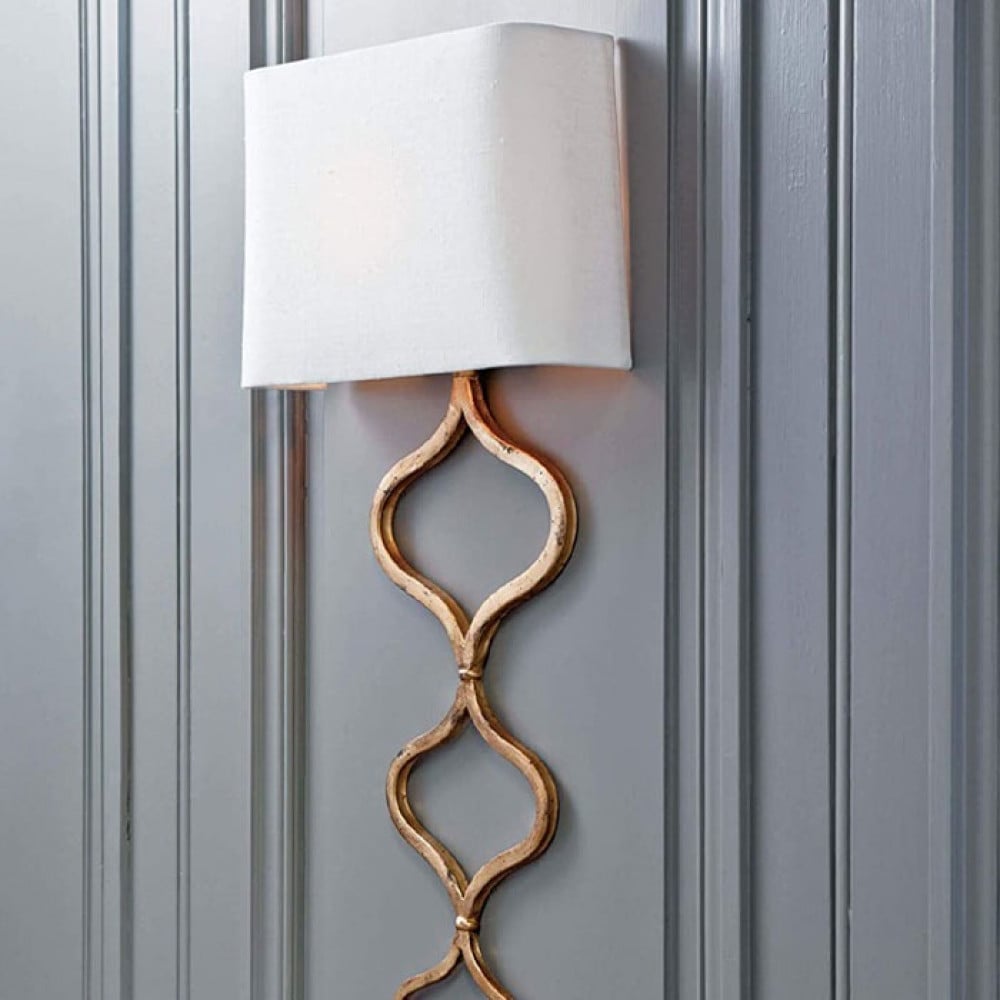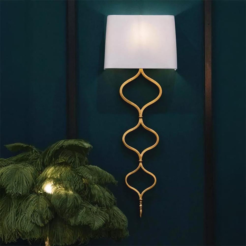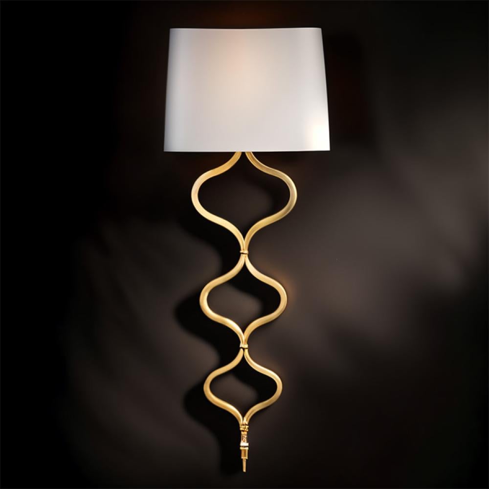 The W6625-S wall light brings refined elegance to your interior with a hotel-inspired, classic design. Featuring a graceful gold base with an artistic zigzag of three interlinked rings and a soft white fabric shade, this piece offers both ambient lighting and a sophisticated decorative accent.