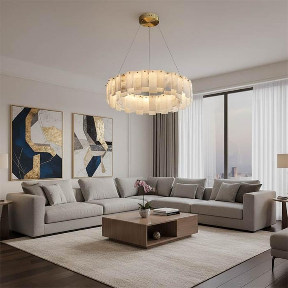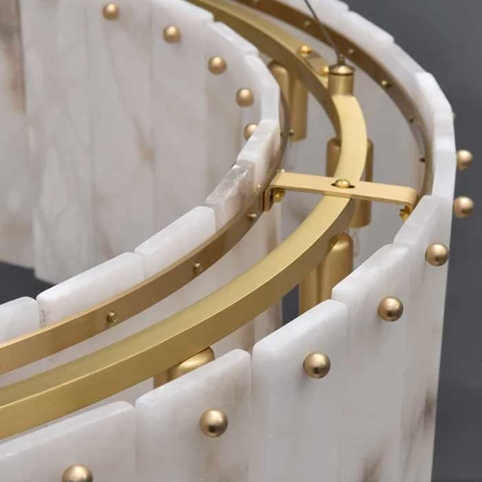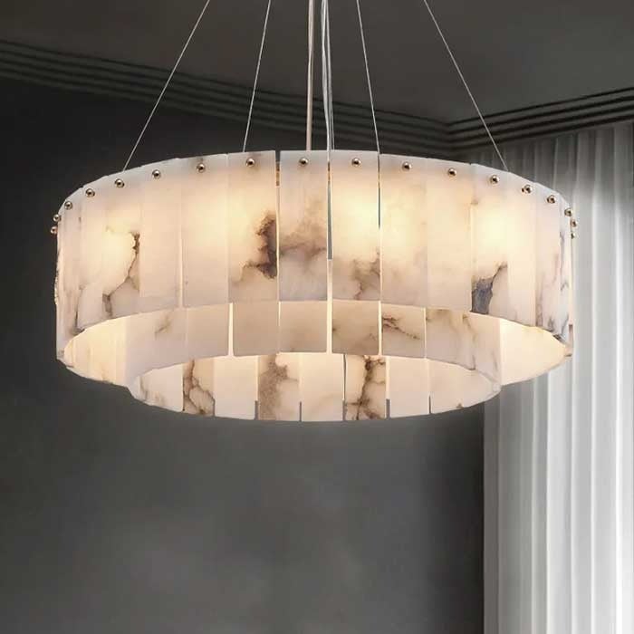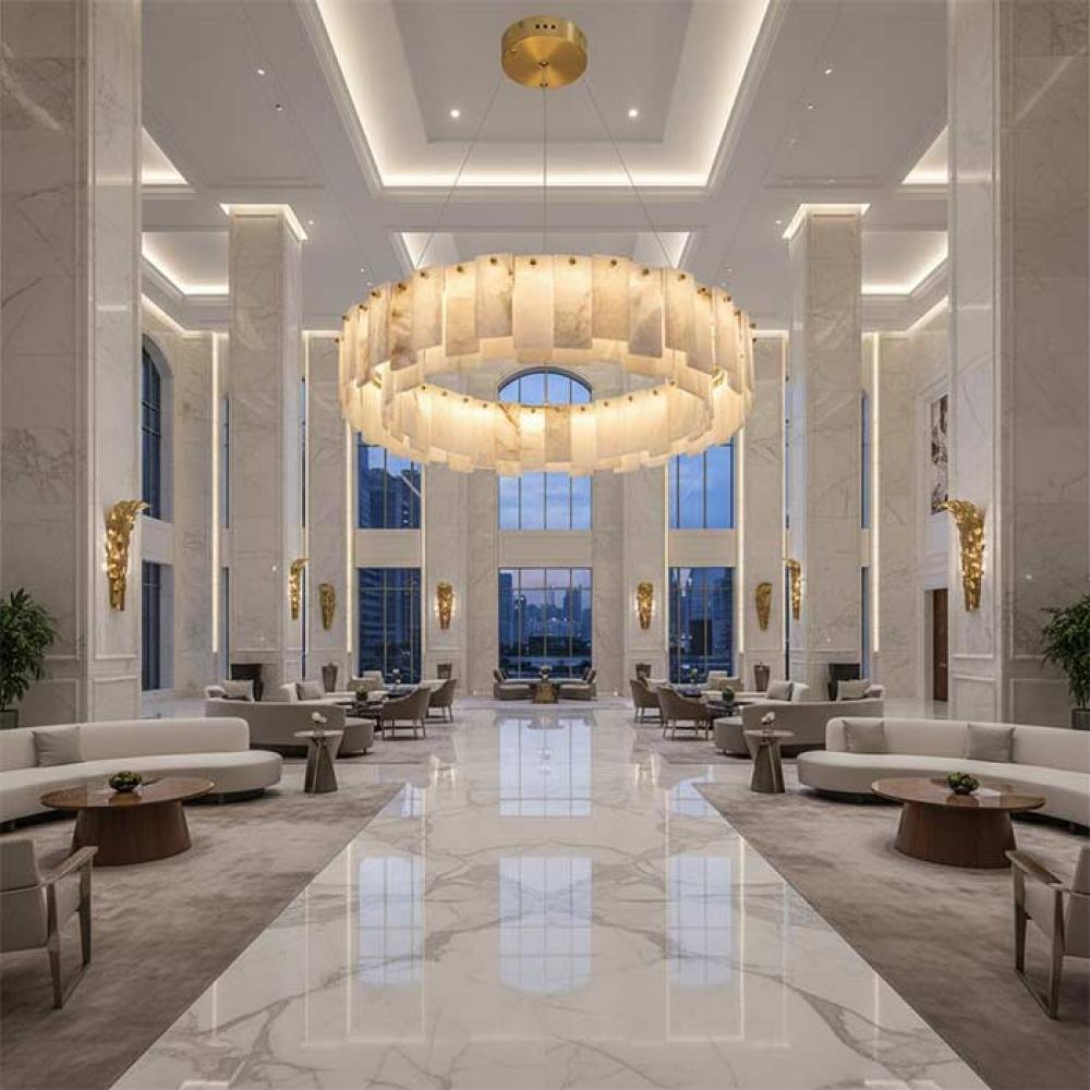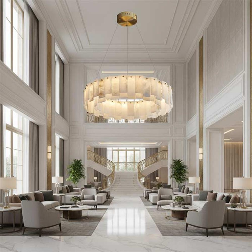 The MD51508 Cylindrical Marble Chandelier is a sophisticated lighting fixture that combines modern design with classic elegance. Crafted from high-quality white marble, it offers both style and functionality, making it an ideal choice for enhancing the aesthetic of any large space. The chandelier's sleek cylindrical shape and the warm light it provides create an inviting and refined atmosphere.
