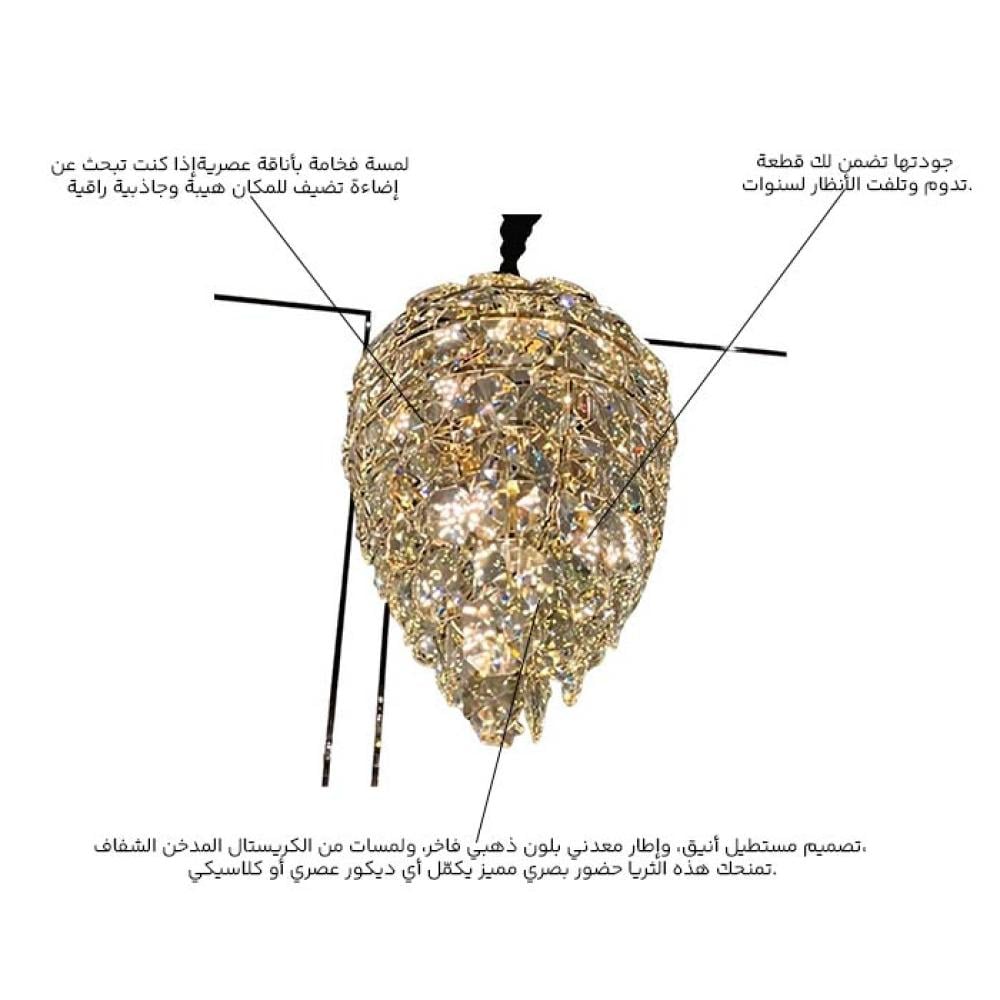 The Crystal Pine Chandelier 88838 is more than just a lighting fixture—it’s a luxurious decorative statement. Designed in a sleek rectangular shape with a golden antique-finished metal frame, it features cascading layers of transparent smoky crystals that reflect light with enchanting softness. Whether you're designing a high-end majlis, a grand entrance, or an elegant reception hall, this chandelier adds visual presence and a perfect balance of opulence and simplicity.