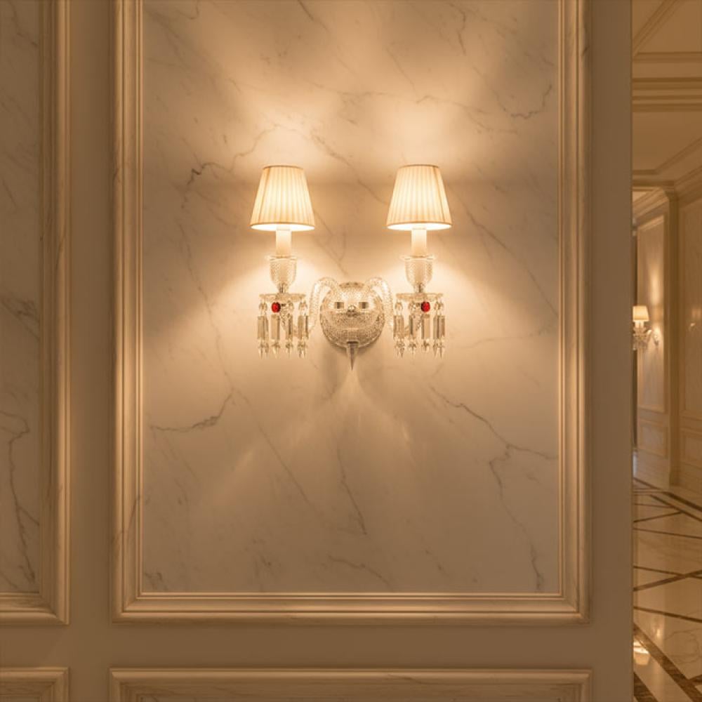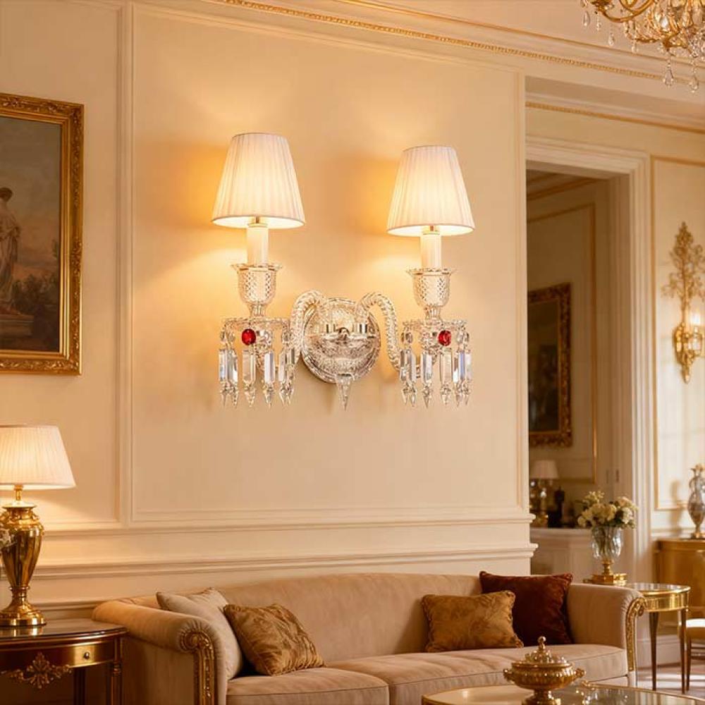 Add a touch of timeless luxury to your home with the Baccarat Twin Classic Crystal Wall Light, crafted from premium K9 crystal and meticulously designed to reflect light with refined elegance. Featuring two E14 lamp holders with sleek metal accents available in luxurious chrome or shiny gold finishes, this fixture makes a striking statement in any space. Its dual-arm design paired with an elegant fabric shade creates warm, inviting light that adds a distinctive artistic flair to your décor.