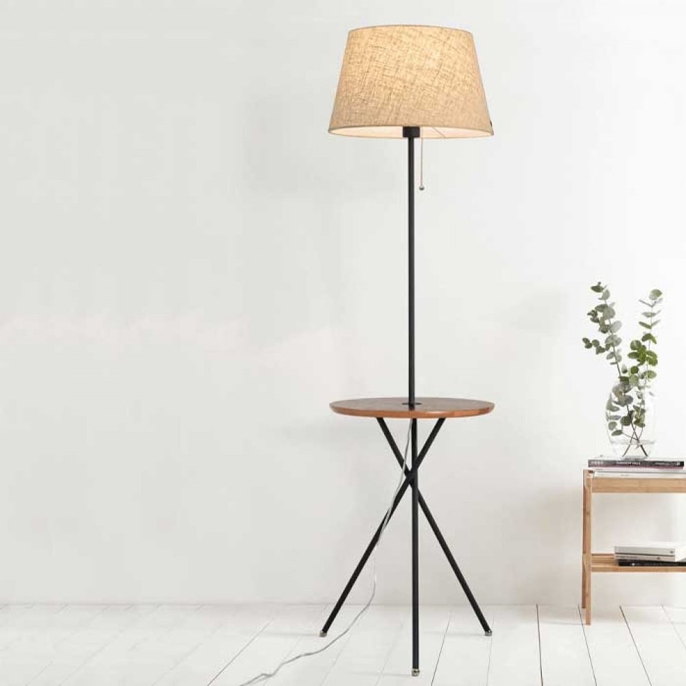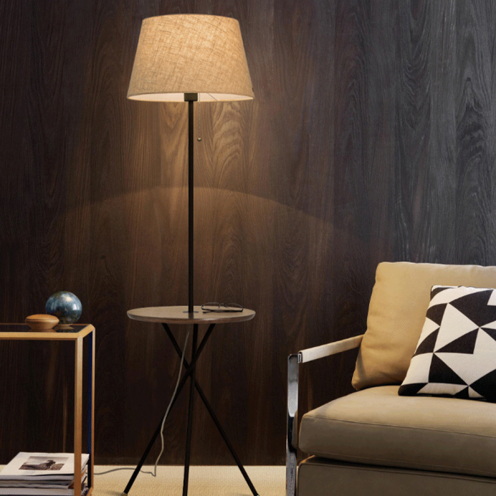 Classic stand with table in black and brown wood color, with a beige circular shade.