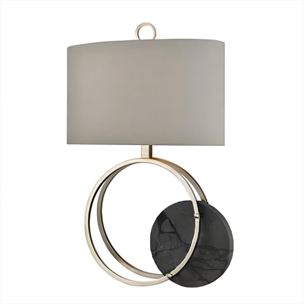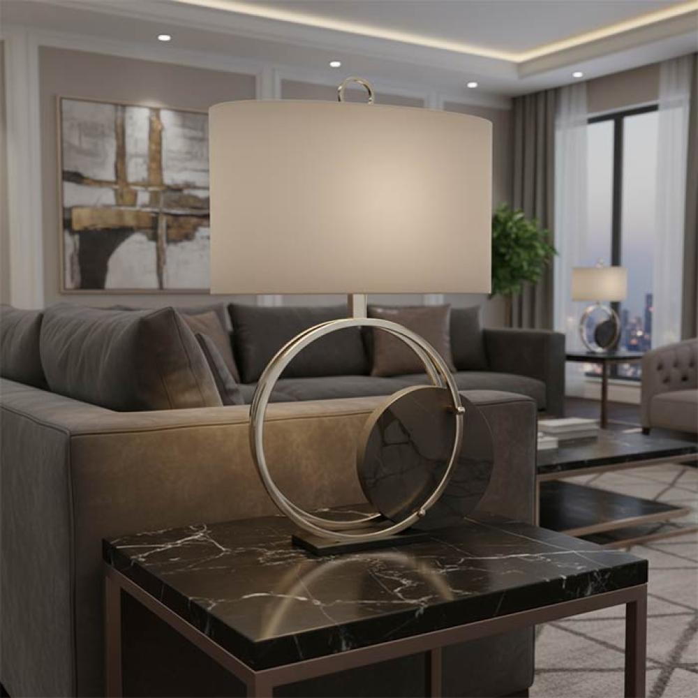 The D4111 table lamp is the perfect fusion of architectural elegance and bold contemporary detail. Its base, crafted from solid natural black marble, offers timeless luxury and visual weight, while the golden metallic ring adds a daring, artistic flair ideal for modern spaces. A soft grey fabric shade completes the look, diffusing warm, ambient light that enhances the lamp’s sculptural presence.