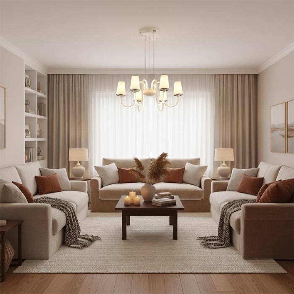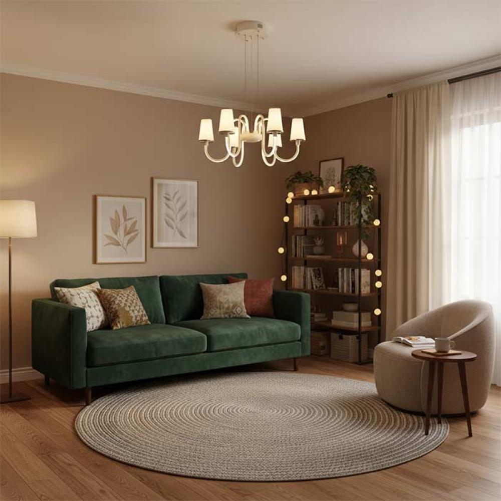 A modern white chandelier with fabric lampshades that combines elegance and functionality, adding a touch of luxury to any interior. Available in two sizes (6 or 9 lampshades), it features premium Samsung LED technology, delivering warm, energy-efficient lighting that enhances your space with both comfort and sophistication.