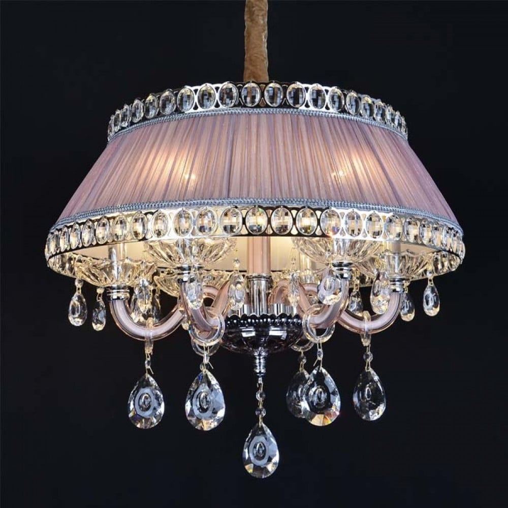 The 6661-4 Mauve Crystal Chandelier embodies quiet elegance and refined taste. Featuring a luxurious velvet-textured fabric shade in soft mauve, the design is adorned with a shimmering crystal belt that reflects light with captivating brilliance. Its inner structure boasts gracefully curved pink-tinted glass arms, from which oval crystal droplets gently hang to cast a soft, glowing ambiance. Accented with a polished chrome finish, this chandelier strikes the perfect balance between classic charm and modern flair—ideal for sophisticated interiors.