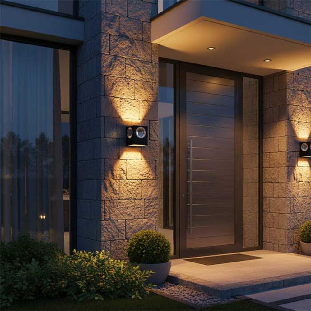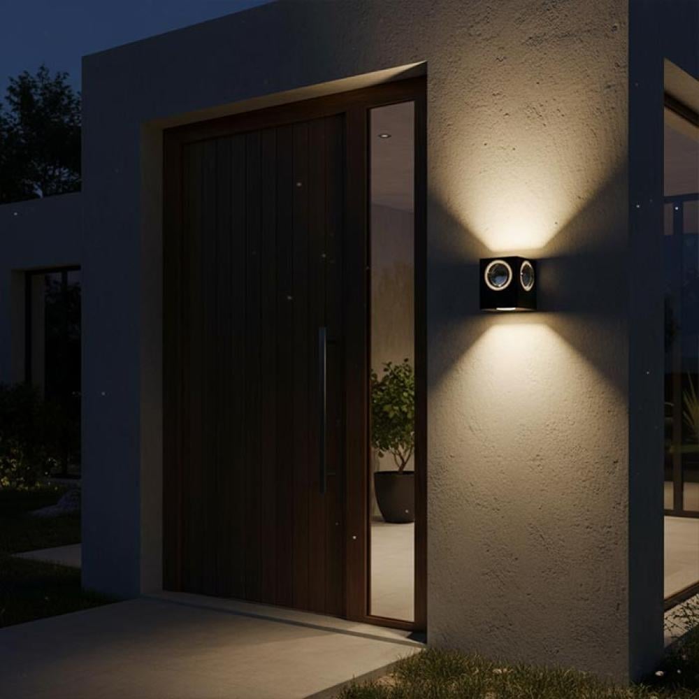 This cube-shaped wall light features four precision optical lenses that distribute light evenly both upward and downward, creating a refined dual-beam lighting effect that enhances any exterior wall.